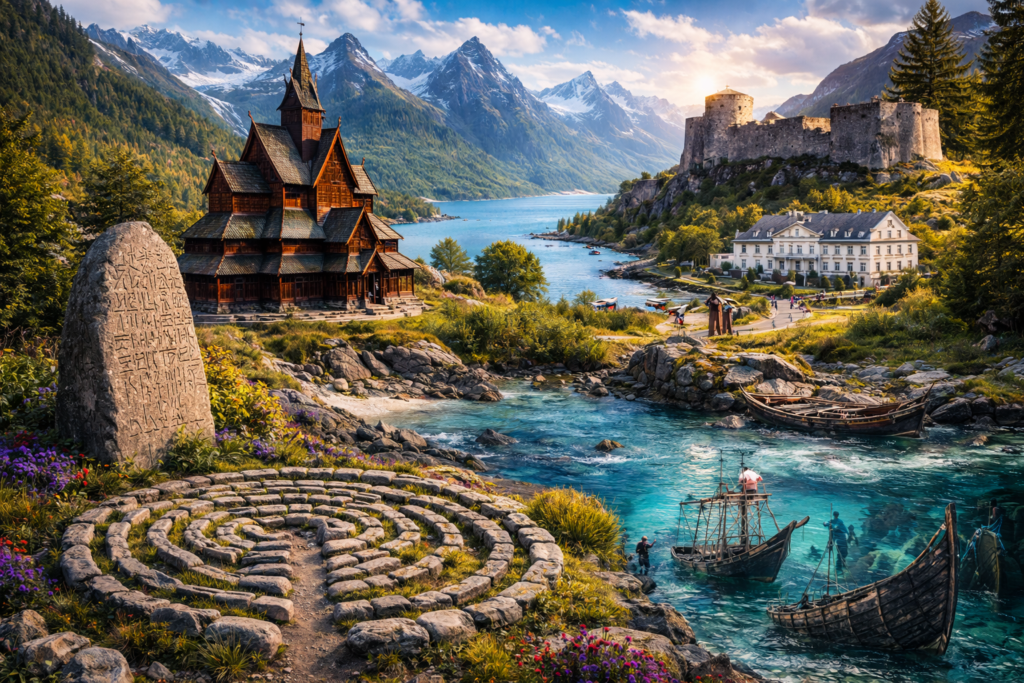 Medieval Norway remains clearly visible in the terrain. The country contains approximately 100 medieval ruin complexes and 28 stave churches — unique wooden structures that merge Christian architecture with older, pre-Christian traditions. Even earlier layers of history are preserved in more than 150 runestones, of which around 50 are especially well known and accessible.