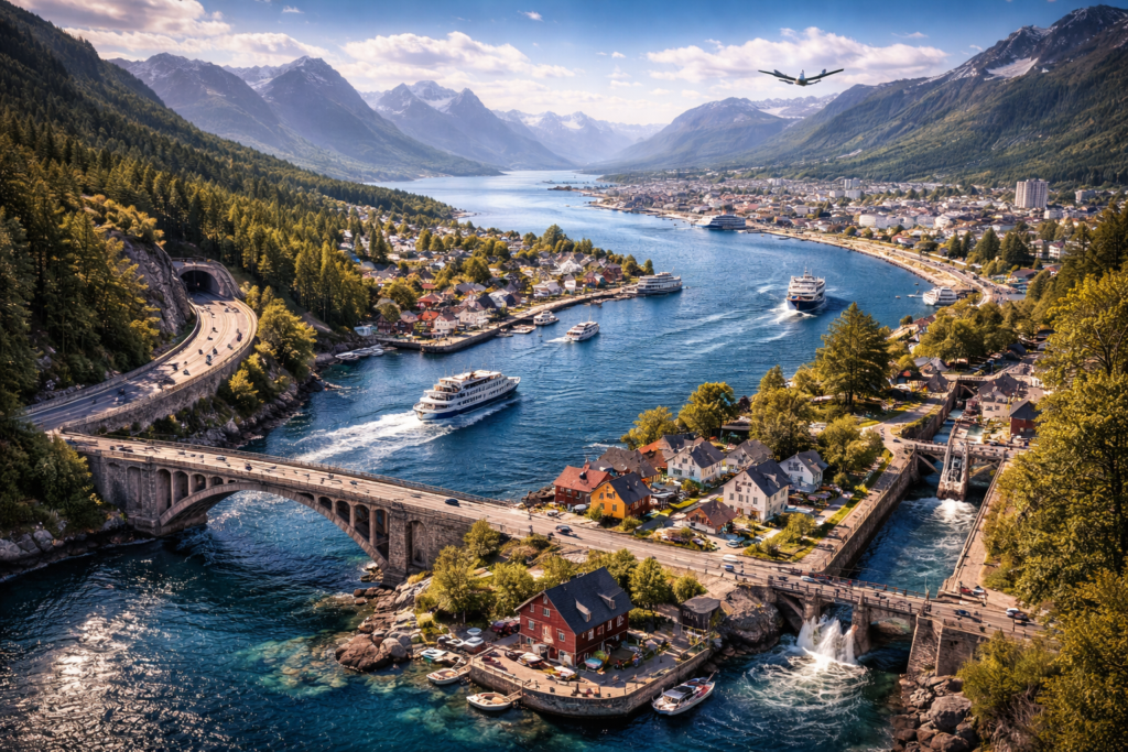 Norway’s infrastructure is adapted to complex terrain. State and county roads are crossed by approximately 19,700 bridges and road structures, supported by more than 1,000 road tunnels. The coastline is connected by around 80 ferry routes, while maritime transport is sustained by 32 main national ports, approximately 600 state-registered fishing harbors, and around 950 guest harbors.